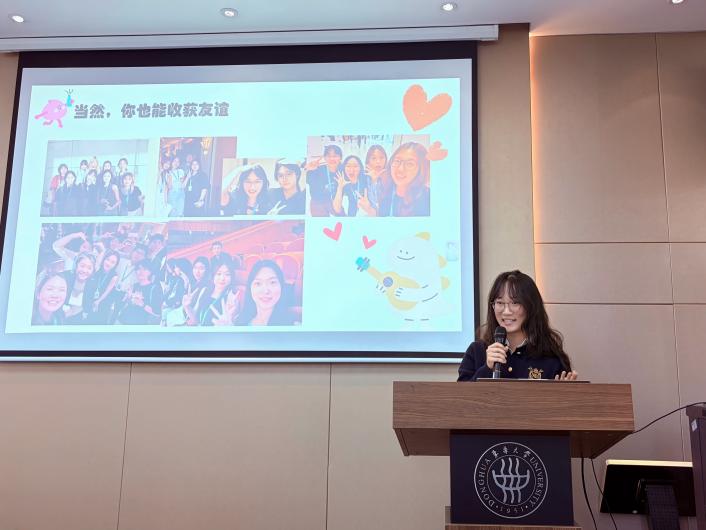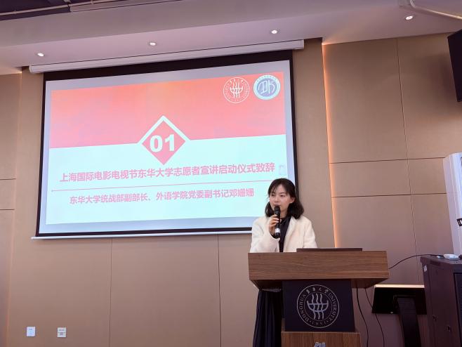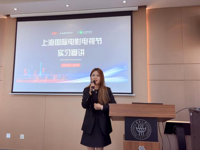 戴昱妍对学院长期以来输送优秀外语人才表示诚挚感谢,介绍了2026年上海国际电影电视节志愿服务项目概况及各岗位工作内容。她对往届志愿者给予高度肯定,并热忱欢迎更多专业扎实、怀揣理想的外院学子加入志愿者队伍,携手助力今年国际电影电视节圆满举办,共谱影视文化交流新篇章。